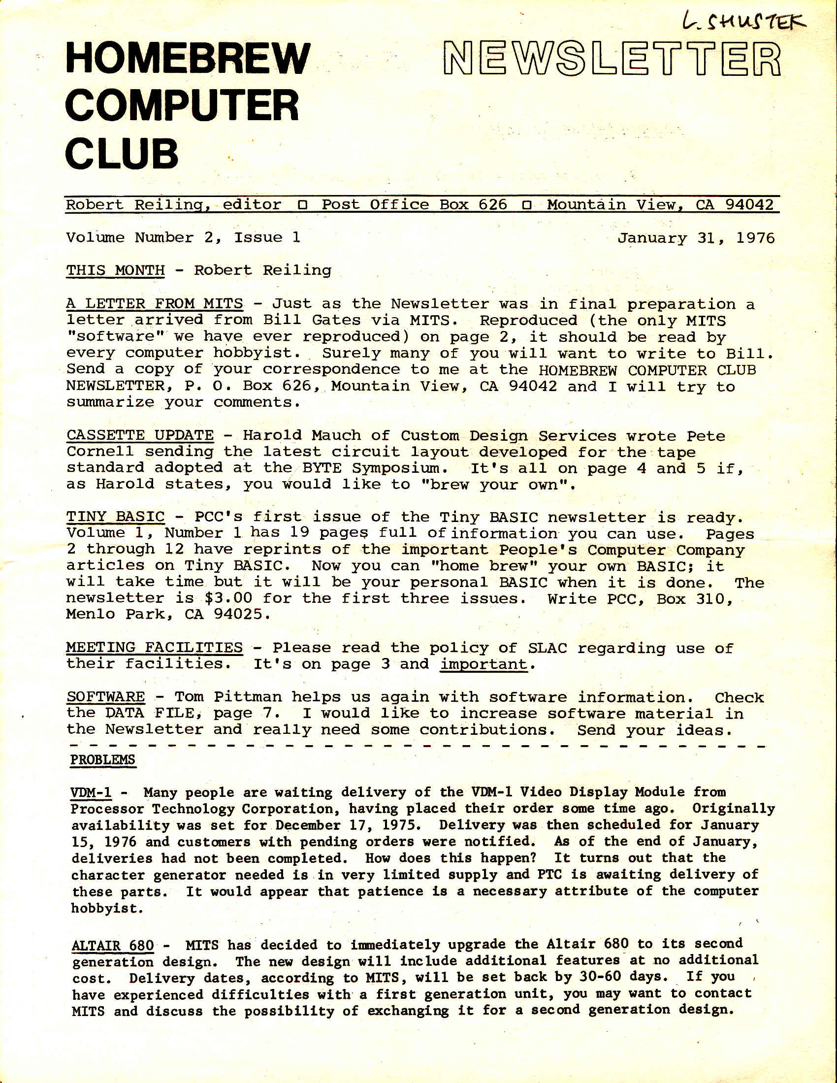 DigiBarn Newsletters: < prev issue --- index --- next issue > Volume 2 issue 1 of the newsletter is presented here. Click on the thumbnails to see full pages. In this issue is the famous open letter to hobbyists by Bill Gates, general partner of Micro-Soft.