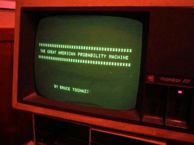 Apple IIe software antics Allan Lundell poses for us with several of the cool programs for the Apple IIe including Bruce Tognazzini's The Great American Probability Machine!. |